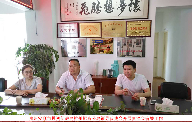 我会对安顺市投资促进局驻杭州招商分局领导莅会考察指导表示热烈欢迎和衷心感谢!我会介绍了商会贵商的行业分布特点和实业发展愿景,并与孔局长一行就商贸信息互动进行座谈和咨询。贵州省“贵洽会”是非常难得的一次商贸合作和发展的盛会,由贵州省政府牵头举办充分说明贵州省政府的重视,我会表示将积极做好宣传,并建议贵州省和安顺市在打造招商项目时能结合贵商需求实际,打造一些适合商会会员企业和在温贵商项目对口、投资资金合适的招商项目,努力达成地方经济发展和贵商实业成长双赢的最佳合作机会。