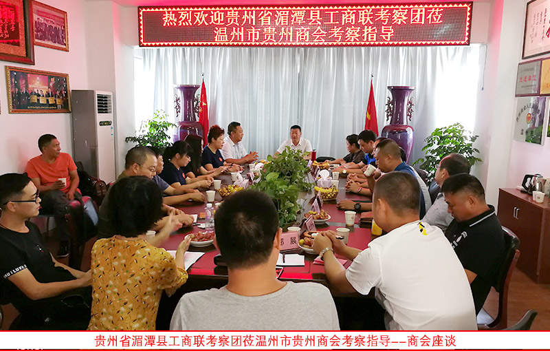 2017年9月11日下午,贵州省湄潭县原政协副主席侯小琴,政协副主席工商联主席谢金权,湄潭县永兴商会会长胡文君,及湄潭县工商联一批企业家一行11人,莅温州市贵州商会考察、指导、交流。我会会长周树芳、常务副会长陈乾、副会长刘勇刚、黄山、余昌凡等迎接考察团一行。瑞安市塘下镇派出所陈所长、塘下镇综治办余主任,代表当地政府部门欢迎湄潭县工商联考察团莅瑞安和塘下考察指导。
