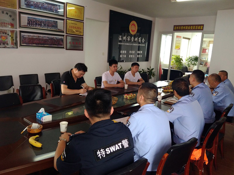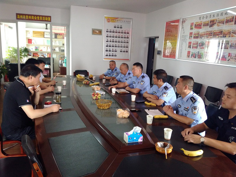 朱帮乐秘书长代表商会对经开区公安分局领导莅临商会调研指导工作表示热烈欢迎。在随后的座谈会上,徐新程副大队长介绍了此次到访的来意,老乡民警工作室和全面优化营商环境的工作思路。据了解,2016年5月27日,经开区公安分局在全市率先建立老乡民警工作室,创新流动人口管理模式。三年来,为经开区20多万外来务工人员提拱便携式司法服务,及时化解劳资和工伤纠纷,保障外来务工人员的合法权益,构建和谐劳动关系,避免引发群体性事件,取得良好成效。这种新时期“枫桥经验”,得到了温州市委、市政府领导的高度好评,并在温州全市公安部门全面推广。徐新程副大队长指出,今年5月23日,贵州籍流浪汉张忠明在温州市中医院抢救,因医疗费不够,在紧要关头商会伸出温暖之手,为患者捐赠医疗费,挽救了他的生命。非常感谢温州市贵州商会对老乡民警工作室的大力支持!