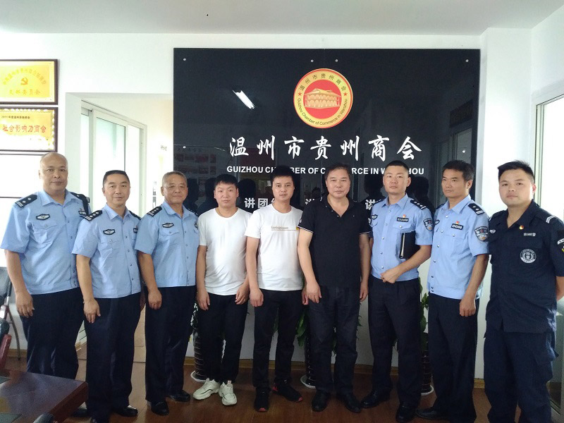6月18日上午,温州市公安局经济开发区分局治安大队副大队长徐新程、老乡民警工作室贵州外警田勇、江西外警刘国平、河南外警闫俊营、四川外警熊联福一行,莅临温州市贵州商会调研指导工作并与商会领导进行座谈交流,温州市贵州商会副会长季飞、秘书长朱帮乐、理事江山、办公室主任罗月仙参加座谈会。
