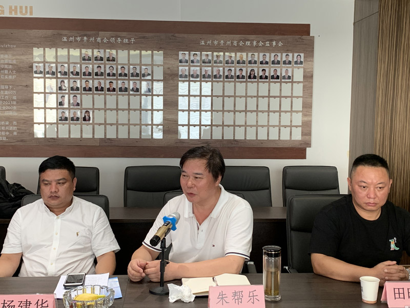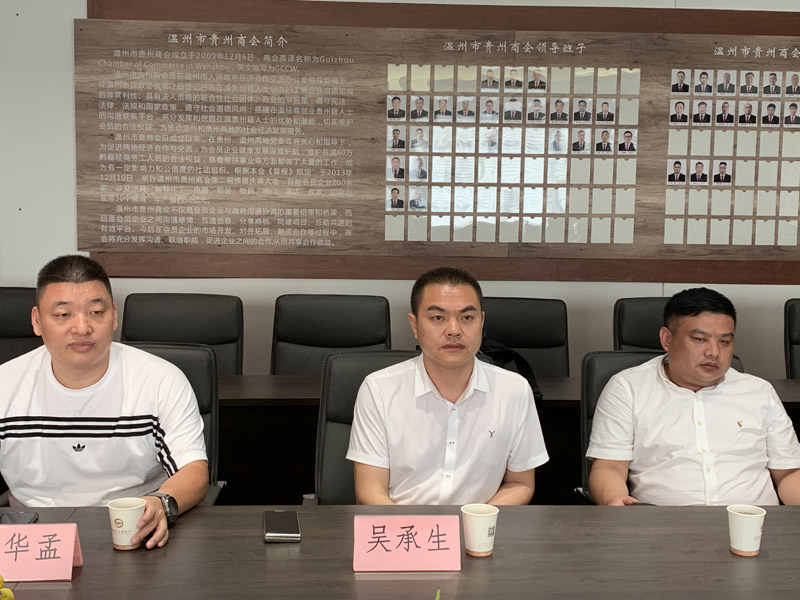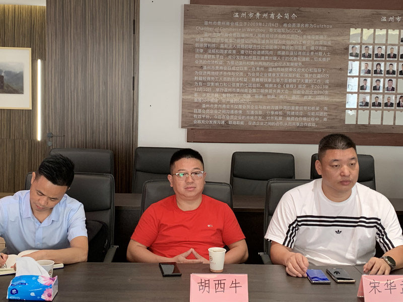 吴承生会长代表商会对家乡领导莅临商会调研指导工作表示热烈欢迎!在随后的座谈会上,席宁主任介绍了此次到访的来意,了解在温州贵州籍企业发展情况和回乡投资意愿。吴承生会长介绍了商会组织建设、品牌建设、回乡投资、公益慈善等方面的情况。他指出,近三年来,商会组织会员回乡投资项目105个,总投资额38亿元,为家乡发展做出了积极的贡献。贵商回乡投资既是一种情怀,也是自身发展壮大的要求。商会作为政府与企业的桥梁和纽带,既是政府招商引资的抓手,也是企业抱团发展的平台,温州市贵州商会将继续发挥好桥梁纽带作用,为促进贵温两地经贸合作交流贡献更大力量。